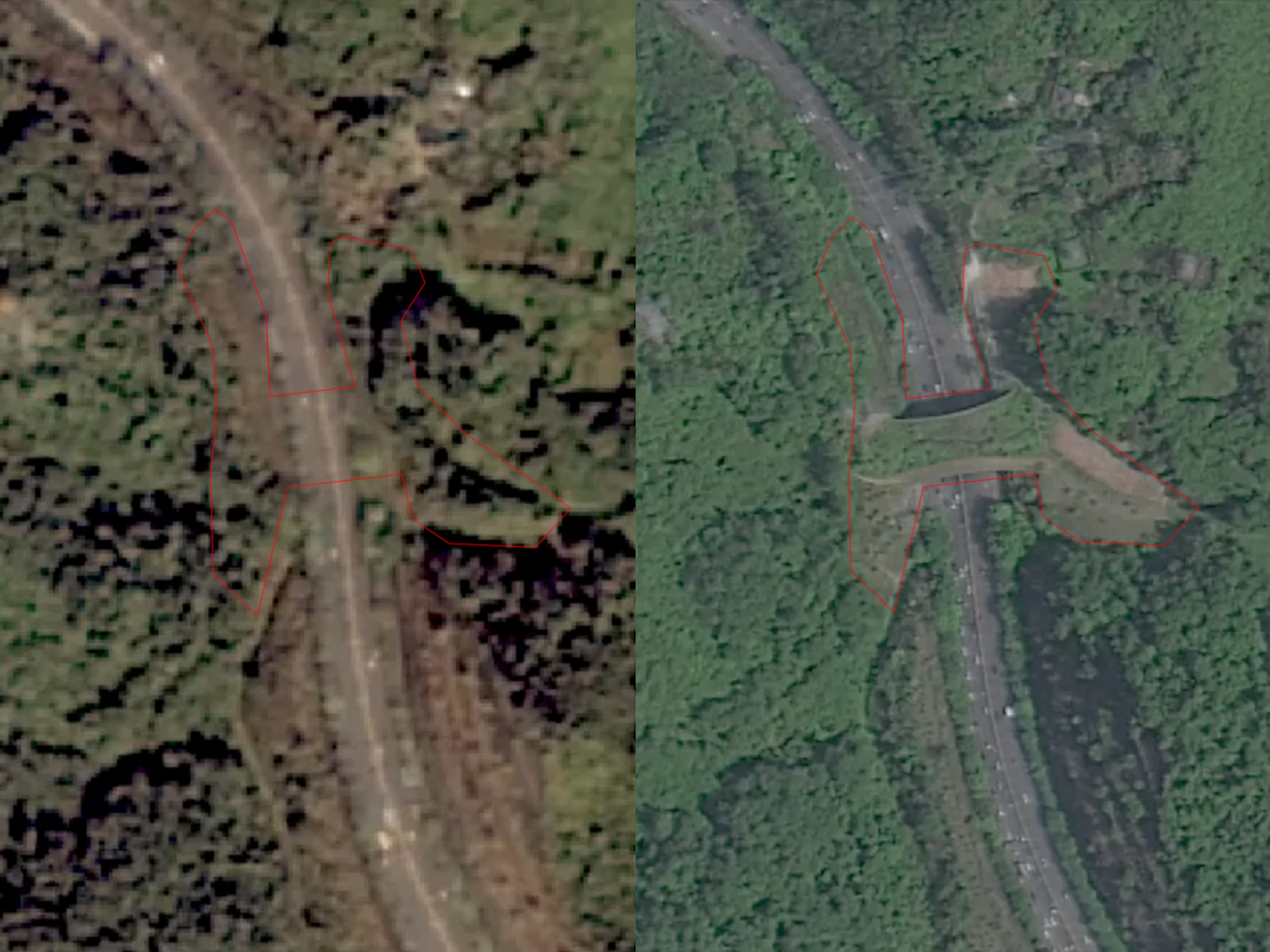 曾经,道路的建设割裂了梅林山和银湖山,切断了野生动物的通道。卫星图像显示,鲲鹏径一号桥的搭建“缝合”了深圳中部山脊线,乔木林、灌草丛、池塘湿地多样生境,方便了动物迁徙与觅食,红外相机多次记录下豹猫等野生动物的身影。