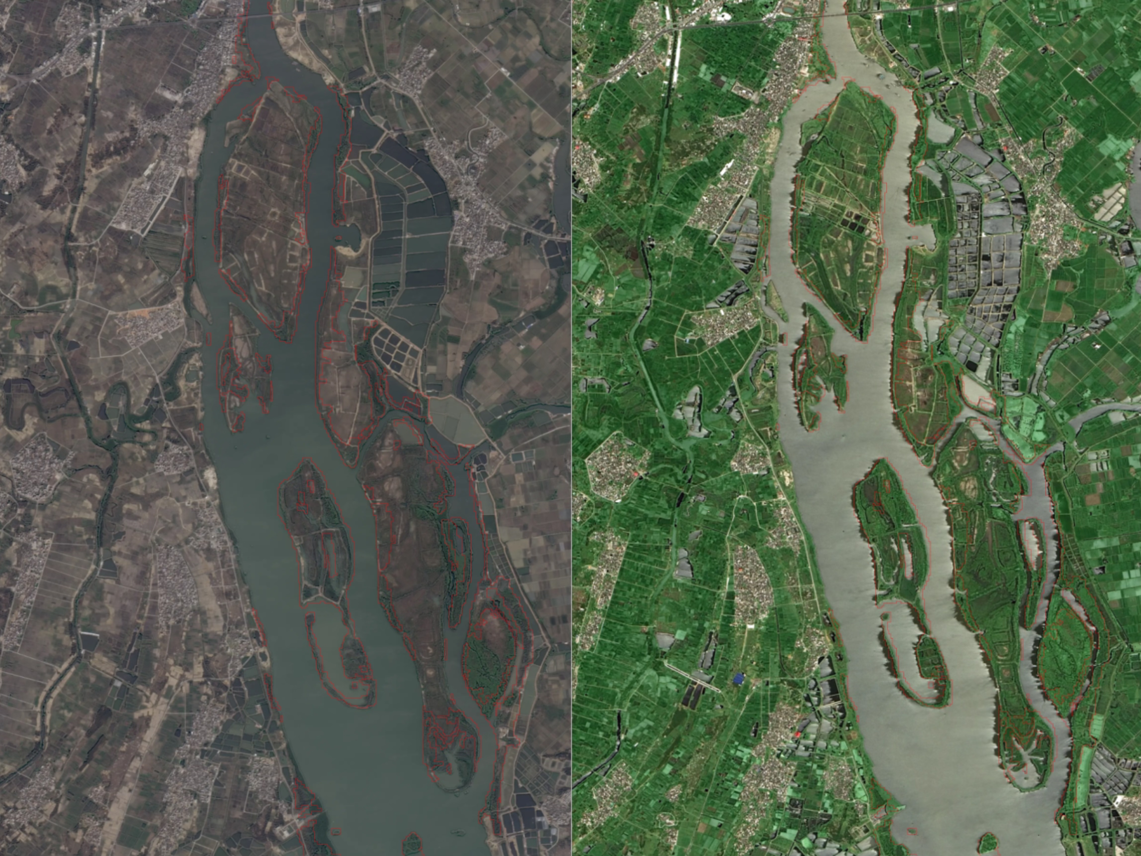 广东湛江红树林2020年(左)和2025年(右)的卫星图 图源:生态环境部
