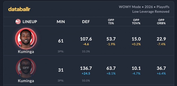 据统计,本轮系列赛当库明加在场时,老鹰防守效率107.6,对手真实命中率53.7%,对手失误率15%,对手进攻篮板率22.9%。